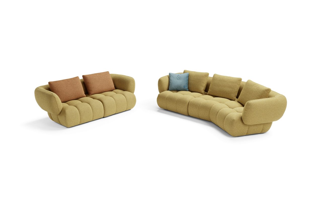 一體成形的梳化以柔和的線條為其特色,座位上寬大的幾何車線突顯其既原始又現代的輪廓。